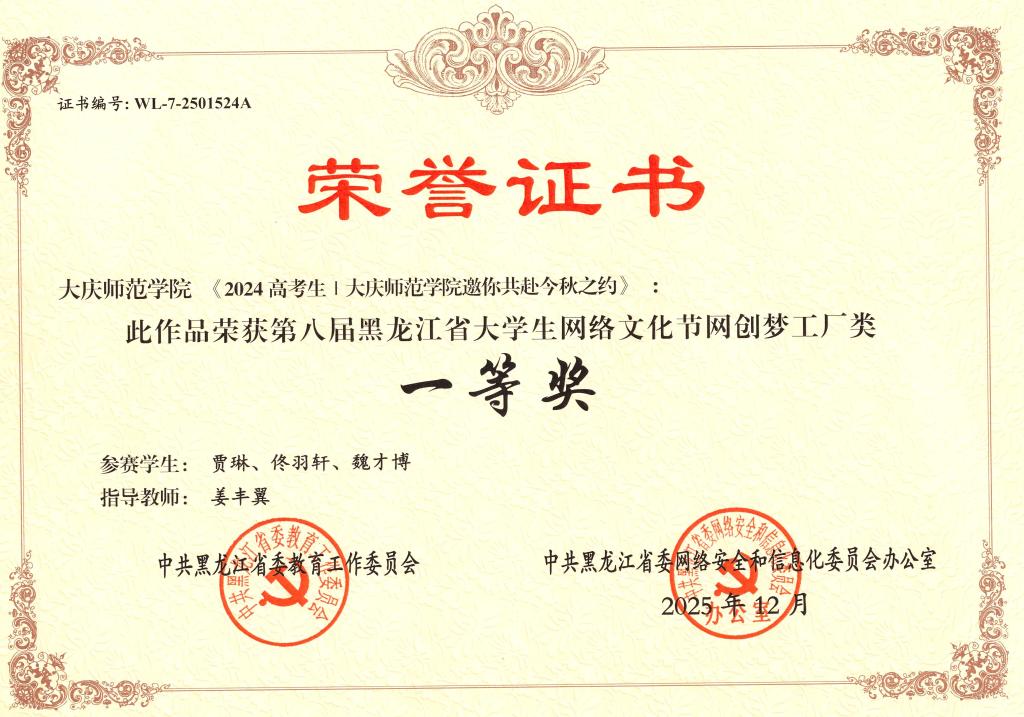 近日,由省委教育工委、省委网信办联合举办的第八届黑龙江省大学生网络文化节和黑龙江省高校网络教育优秀作品推选展示活动顺利收官。本次评选,我院学生贾琳、魏志敏、...