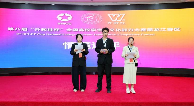 2025年11月15日-16日,第八届“外教社杯”全国高校学生跨文化能力大赛黑龙江赛区复赛及决赛在黑龙江大学举行。由我校外国语学院张钰莹、教师教育学院李珍盈和法学院李世民三位同学组成的代表队凭借扎实的语言基础、深刻的跨文化意识与良好的团队协作能力,荣获黑龙江赛区二等奖。