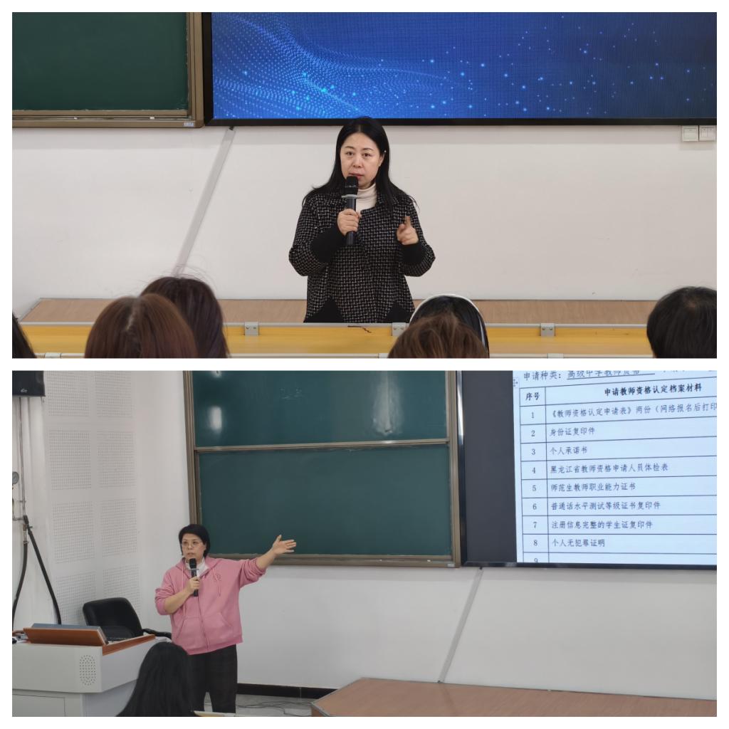 王宏伟老师作实习动员讲话,她充分肯定2023级学生的学习与实践表现,勉励大家珍惜实习机会,积累教学经验,夯实从教基础。吴晓丹老师就2027届预毕业生校内教师资格认定相关政策进行解读,详细说明认定流程、材料准备及注意事项,为学生答疑解惑。