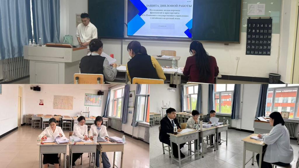 答辩现场氛围严肃而热烈。毕业生们围绕“生成式人工智能在初中英语写作教学中的应用”“4R理论下蜜雪冰城亚洲营销发展策略研究”“跨文化交际视角下大庆旅游文本外宣翻译方法研究”“《习近平谈治国理政》中俗语和成语的俄译方法研究”“宫崎骏电影中生态共生观的研究”等选题,系统阐述研究背景、核心观点与创新点,展现出比较扎实的理论功底与研究能力。