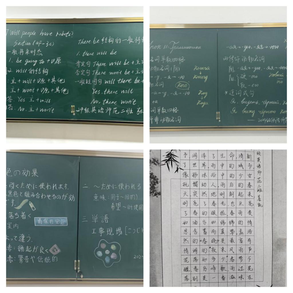 本次竞赛共设置规范书写与板书设计两个环节。规范书写环节为汉字书写,强化师范生的规范汉字书写能力;板书设计环节将英、日、俄三个语种的教学设计用板书清晰呈现,展示不同语言的独特魅力。